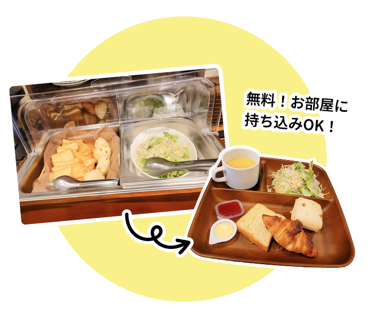 朝なら朝軽食コーナーのをパンやスープをお召し上がりいただくこともでき、いずれも無料&お部屋へのお持ち込みOK!
